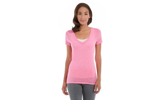 The Karissa V-Neck Tee features a semi-fitted shape that's flattering for every figure. You can hit the gym with confidence while it hugs curves and hides common "problem" areas.