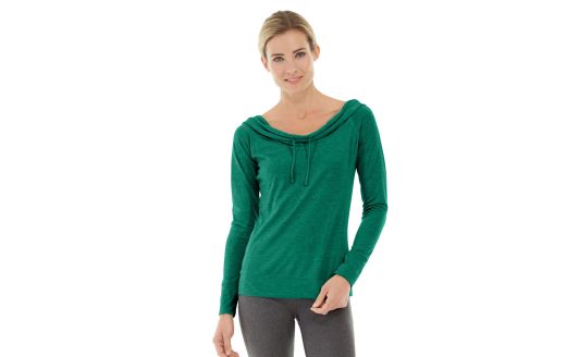 Whether you're after energizing activity or eye-catching apparel, the Mona Pullover is what you want. You'll stay warm and look fashionable, wherever you are. • Light green heathered hoodie. • Long-Sleeve, pullover. • Long elliptical hem for extra coverage. • Deep button placket for layering. • Double rib design. • Mid layer, mid weight. • 98% Merino Wool / 2% Spandex